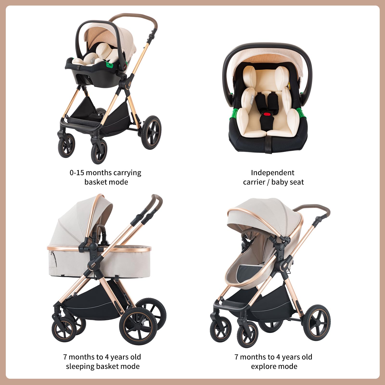 BEBBY D2 Cochecito 3 en 1 para Recién Nacido, Plegable con 1 Clic, Marco de Aluminio, Paisaje Alto, Marrón Claro