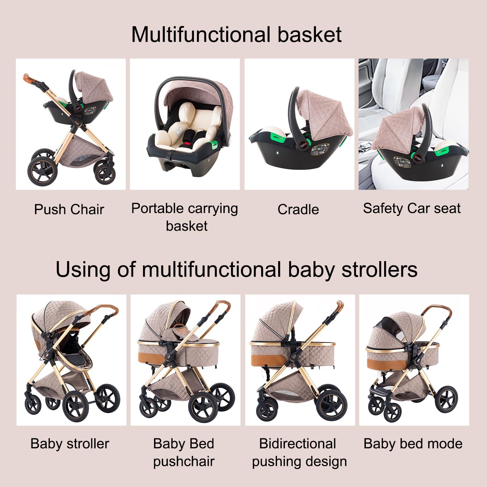 - El cochecito es adecuado para 0 a 15 meses y se puede convertir en un cochecito adecuado para 7 a 36 meses. El asiento se puede instalar en ambas direcciones. Cinturón de seguridad ajustable de cinco puntos. Hay tres modos de ajuste para la capota entera del cochecito: 135° Modo cochecito de bebé sentado, 150° Modo de descanso 180 °Modo cochecito horizontal.