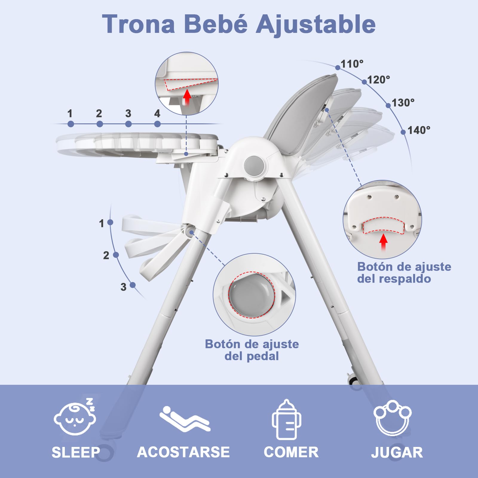- Trona Bebé Multifunción: Esta trona para bebé tiene múltiples modos: Trona alta para alimentar, Trona baja para alimentar, tumbona para bebés, silla infantil sin bandeja y silla de ruedas cómoda. Basta con ajustar la silla de acuerdo con las necesidades del niño.
